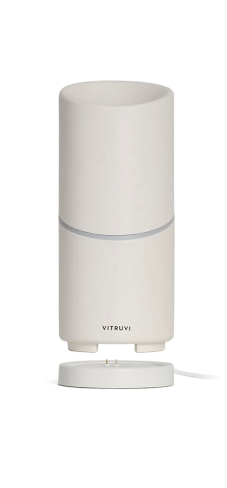 The Move Diffuser is ultrasonic, meaning it uses water and vibrations instead of heat. To use the Move Diffuser, charge it by plugging the cord into the back or setting it on the provided charging pad. Then simply fill the water reservoir to the fill line, add 20-30 drops of Vitruvi essential oils, put the cover back on, and select your time setting.